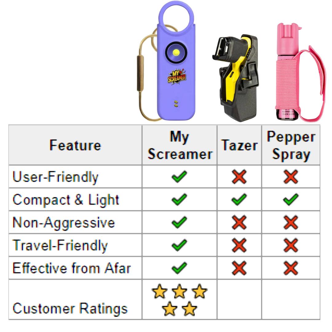 My Screamer stands out when matched against other self-defense tools, offering simplicity, a non-violent approach, and much more.